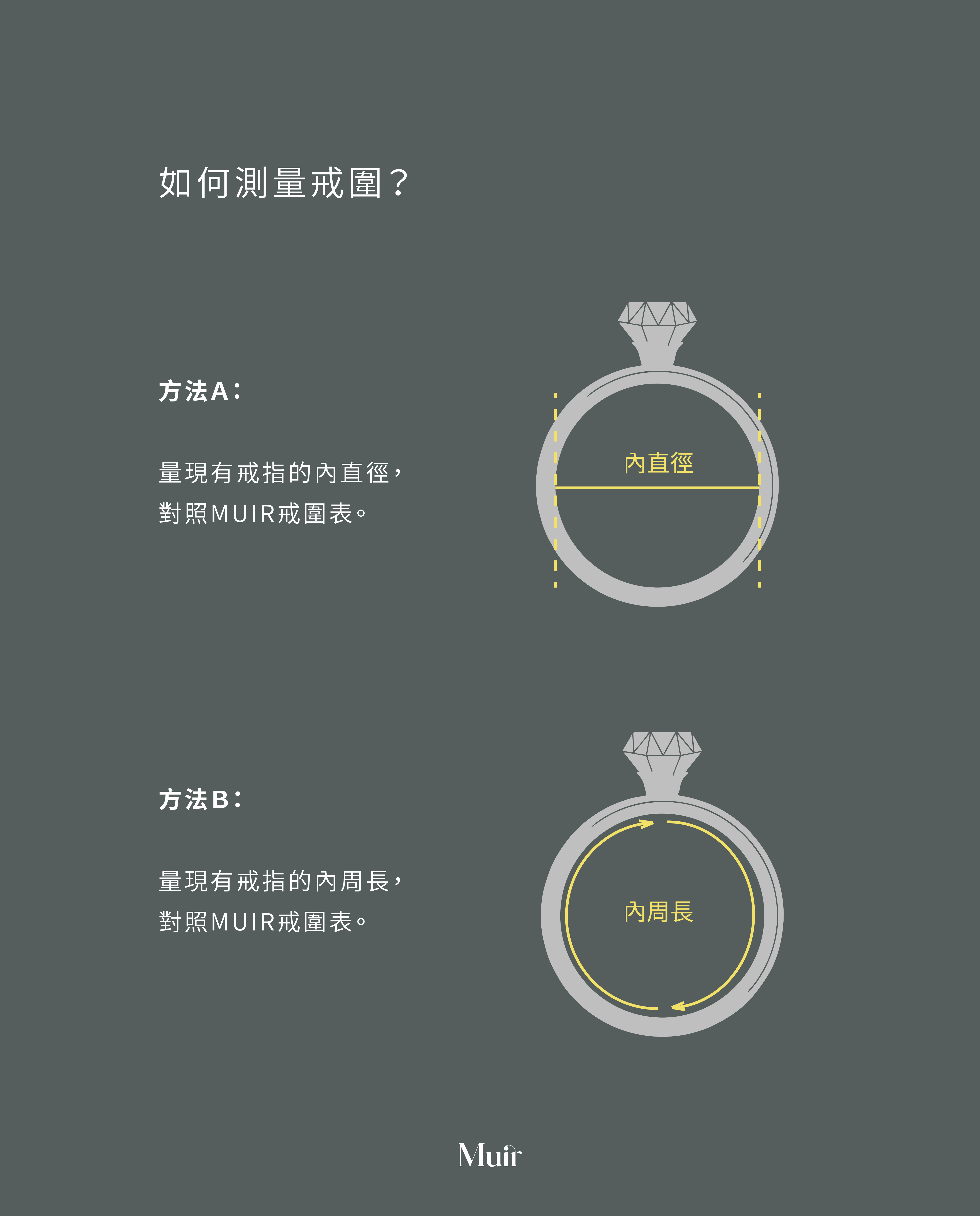 • 戒指若因尺寸不合需退換貨,請消費者於鑑賞期7日內(含收貨當天)至官網聯繫並將商品連同所有原包裝一併寄回,MUIR將為您進行後續處理。